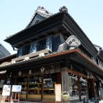 陶舗やまわの店蔵は、川越大火後の明治26年に建てられ、現存する入母屋形式の土蔵造りとしては日本で最大級の規模です。5つの観音開きの窓を持ち、4段の厚く長い軒蛇腹の上に大きな千鳥破風が南面しています。また、目を大屋根、降り棟、鬼瓦が隅棟に接するあたりに転じてみると、そこに鬼門を見すえる6寸ばかりの瓦製の鍾馗様の姿があります。剣を右手に豊かな黒鬚を逆立て、屋敷全体をその小さな体で精一杯守護するかのようで、愛らしいです。